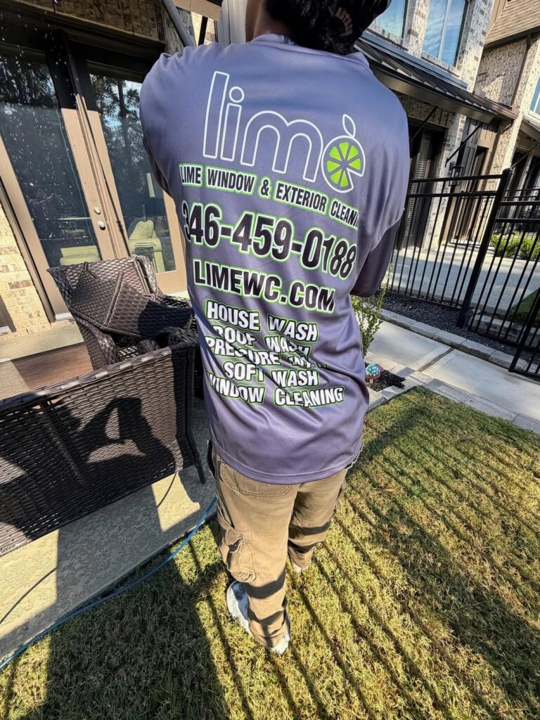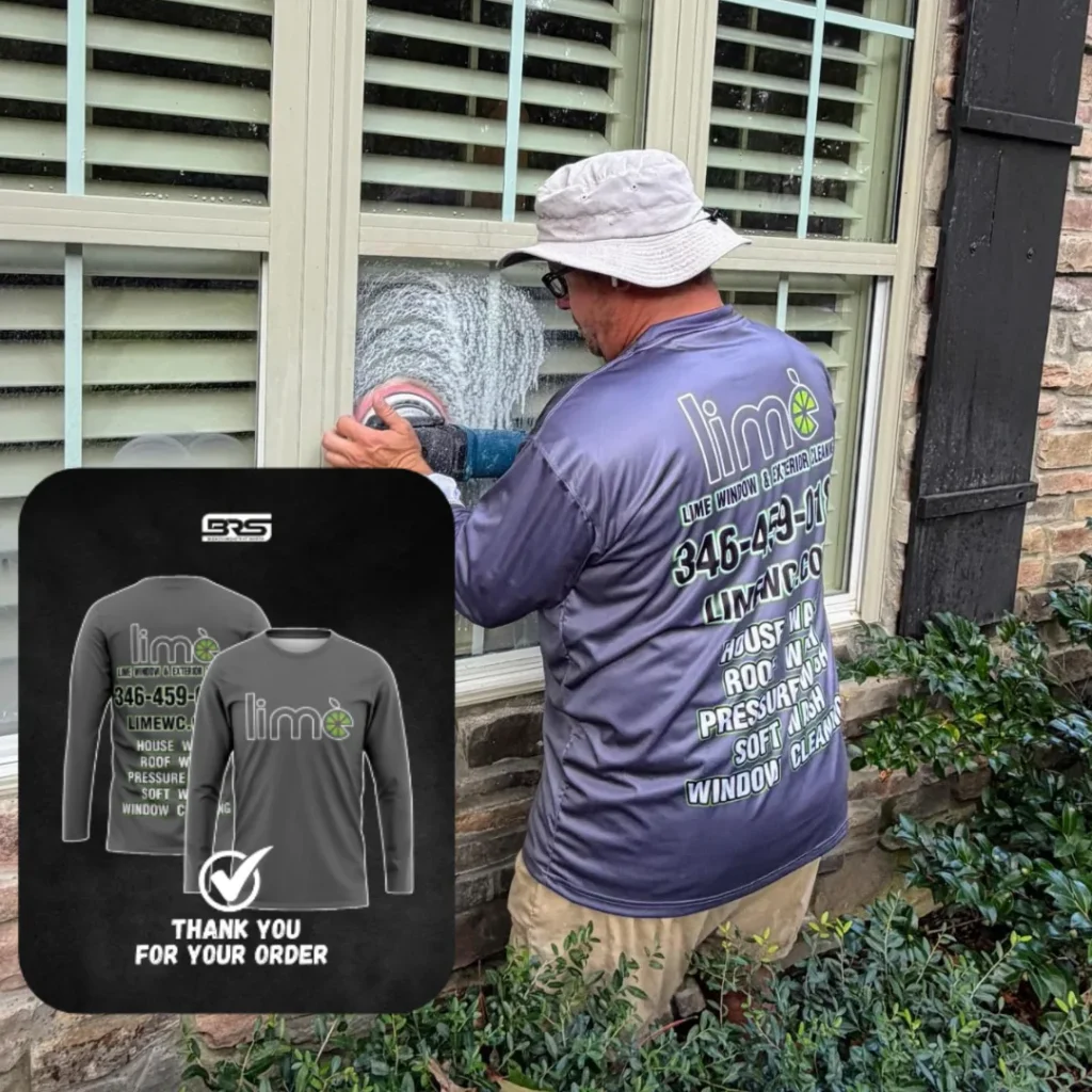 Lime Window and Exterior Cleaning is a family owned business that works in the Montgomery County and North Houston area. Their team cleans windows, driveways, houses and more. They work outside every day and use bleach and strong cleaning products. Their old shirts faded fast and did not look good in front of customers.