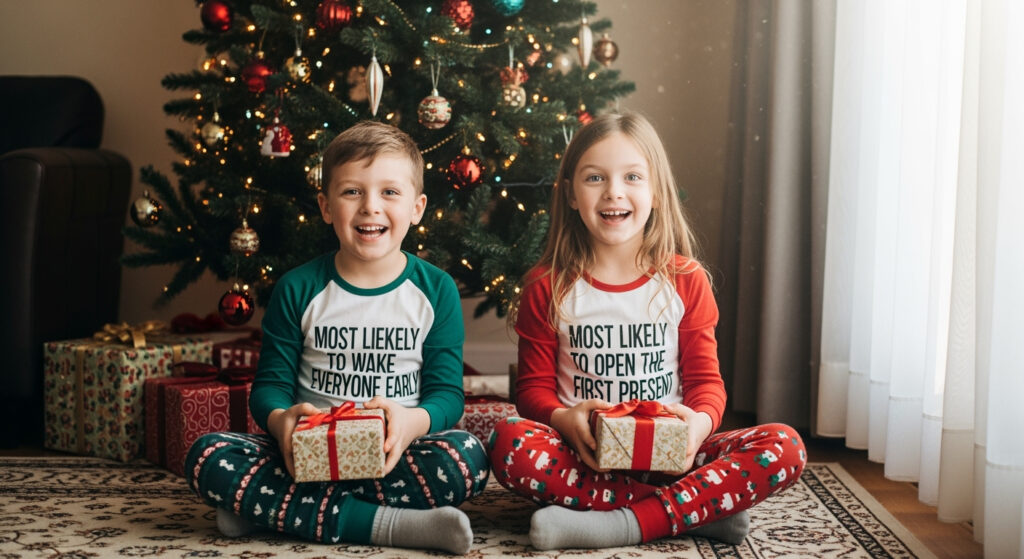 From “Most likely to eat all the cookies” to “Most likely to watch every Christmas movie,” these shirts bring humor and personalization into your holiday wardrobe. And the best part? You can find them ready-made or design your own to perfectly match your family’s personalities.
